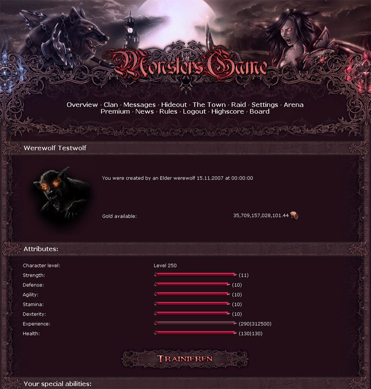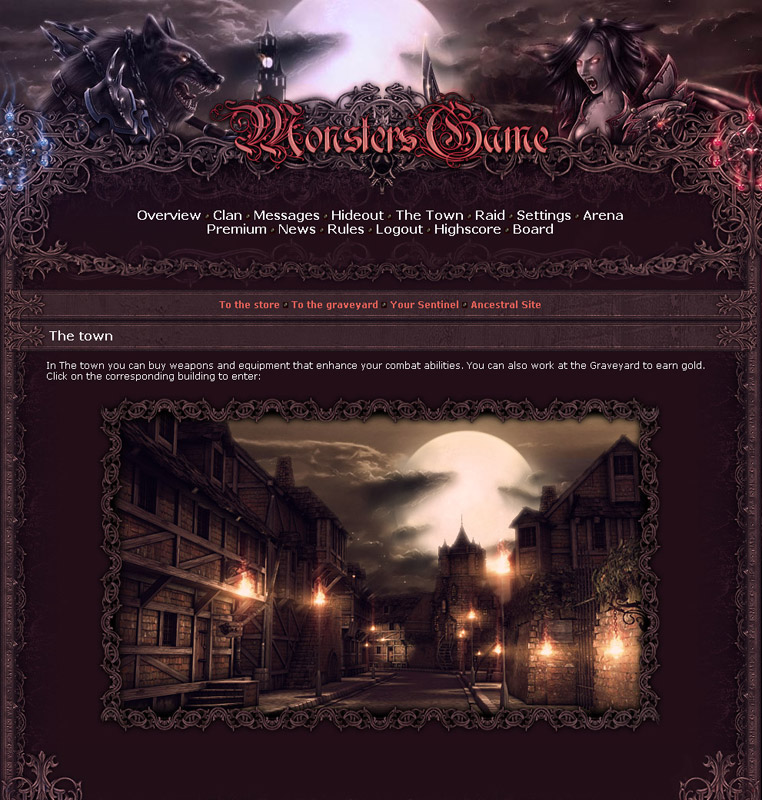 Appena registrato vi ritroverete nella pagina di status del vostro personaggio GDR. Qui potrete trovare importanti informazioni riguardo il vostro personaggio e le vostre vittime del link del morso, con il quale sarete in grado di trovare vampiri in posti remoti di internet, sistemando il link in modo appropriato. Per esempio, puoi spedire il link ai tuoi amici, metterlo nella tua home page, o usarlo come firma in forums. Se una vittima non sospettosa cliccherà, potrete morderla e ricevere 1-3 litri di sangue (se siete vampiri) o 1-3 chilogrammi di carne (se siete lycan). Inoltre la stessa quantità di oro verrà aggiunta al vostro account di gioco. Se la vostra vittima si registrerà a Monsters Game, voi avrete creato un nuovo vampiro/lycan, e riceverete il 25% del bottino che lui guadagnerà con le sue vittime su internet! Quando il personaggio che voi avrete creato raggiungerà il livello 3 riceverete 50 monete e 1 punto esperienza! Potete investire il vostro oro nell'allenamento del vostro personaggio per l'accrescimento dei suoi attributi o comprare ed evolvere il vostro Nascondiglio per proteggervi dagli attacchi della razza avversaria.
