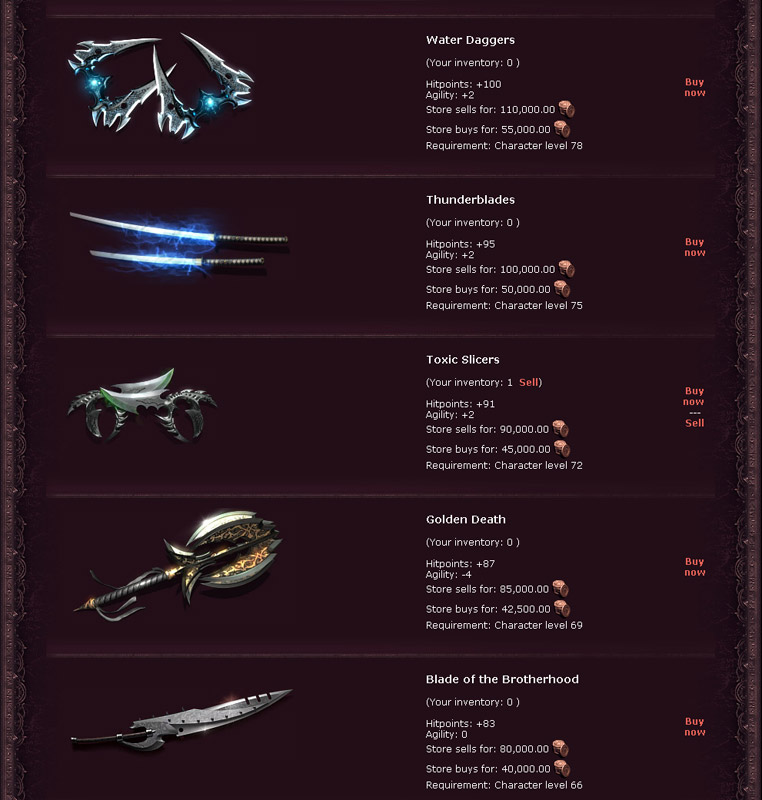 Il link "Premium" vi porta nella zona dove si possono acquistare Gocce di Sangue. Nel Tempio del Sangue potete usare le Gocce di Sangue per acquistare estendioni al periodo Premium del tuo account di gioco o cambiarle in oro con un tasso di cambio dipendente dal livello. Le Gocce di Sangue possono anche essere utilizzate nel negozio di acquistare amuleti o per migliorare la vostra arma nella pagina dello Status (nella pagina Inventario, se abilitata). Tempio del Sangue